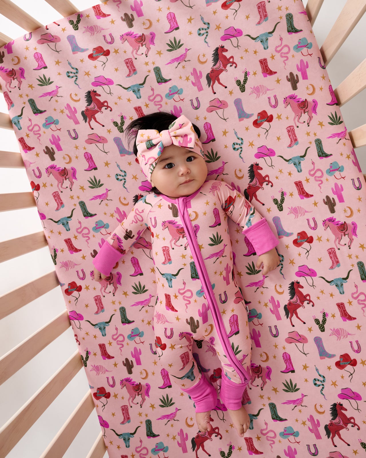 Sweet dreams. little partner. The Rancher Roundup Fitted Crib Sheet features classic rodeo icons on a pretty pink backdrop. Made from ultra-soft Lunaluxe® Bamboo that’s gentle on sensitive skin. this bamboo crib sheet is fully elasticized for a safe and secure fit. Grab the matching Zippy for the sweetest photo-ops!