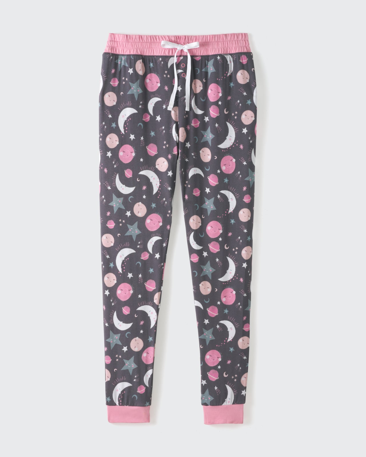 Dream up a galaxy of fun with your kiddos! Featuring pink moons. stars and planets in deep gray skies. these jogger-style PJ Pants are made from buttery soft Lunaluxe? Bamboo. Designed by a mama. they feature stretchy ankle cuffs and pockets deep enough for all your must-haves. Pair them with the matching top to complete the set. then grab matching styles for the whole family!