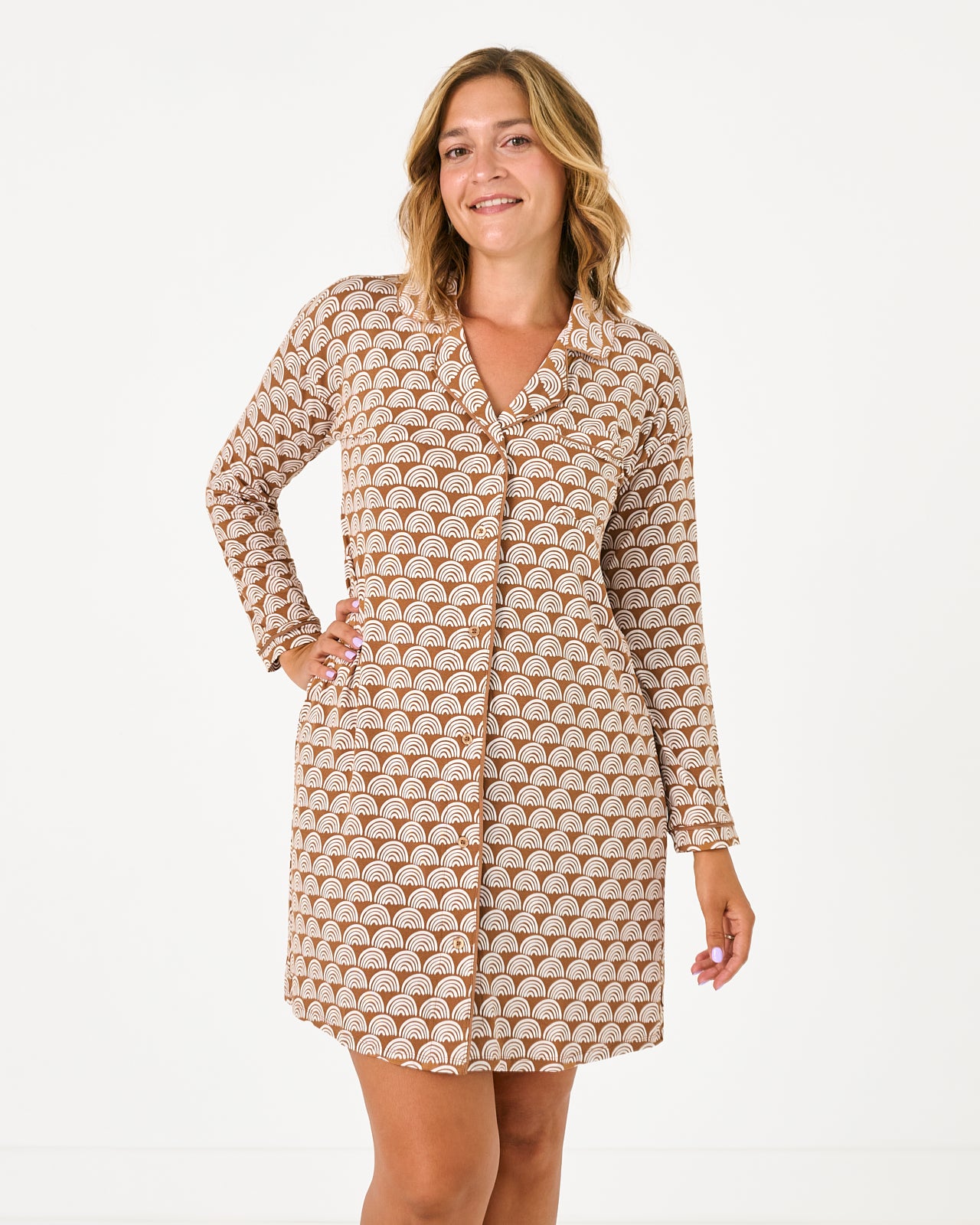 Just the perfect everyday Sleep Shirt! Featuring white rainbows on a neutral background. Rust Rainbows is a fan-favorite print. Made from our buttery soft Lunaluxe? Bamboo and designed by a mama. it features buttons down the front for easy nursing access. Grab styles for mommy & me matching!