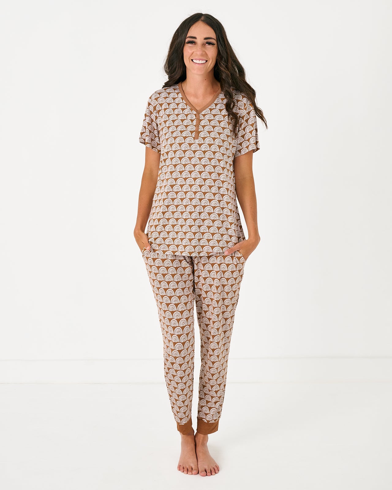 Calling all little dreamers! Featuring white rainbows on a neutral background. Rust Rainbows is a fan-favorite. Crafted from our custom-milled Lunaluxe® Bamboo. these PJ Pants feature deep pockets. a stretchy waistband. and jogger-style cuffs. Pair it with the matching top to complete the set. then grab styles for family matching!