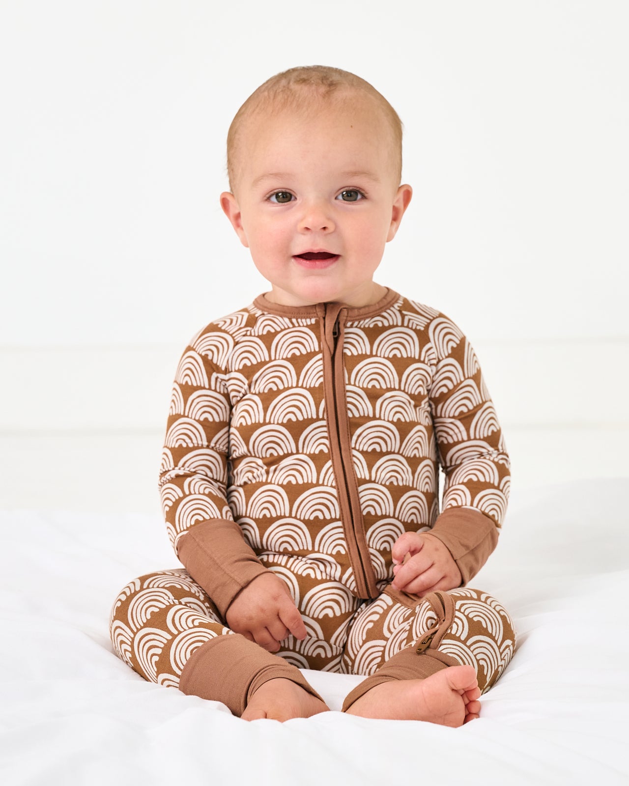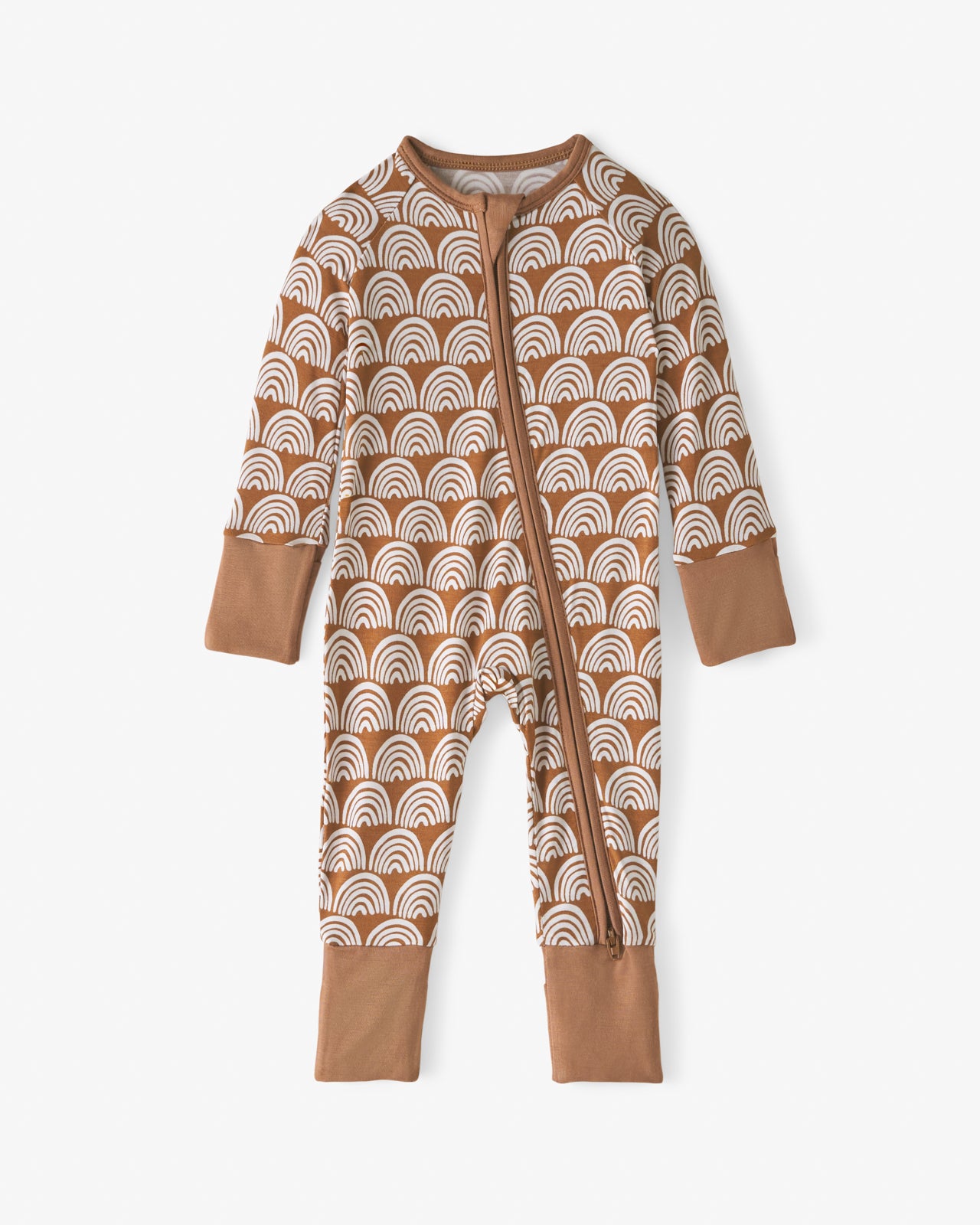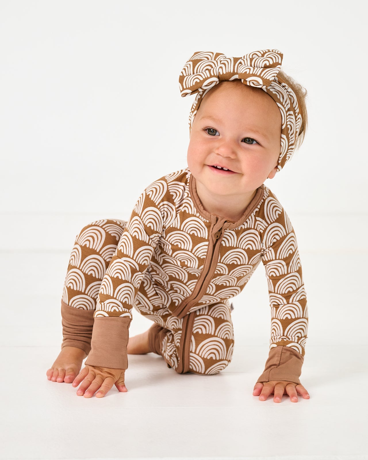 Calling all little dreamers! Featuring white rainbows on a neutral background. Rust Rainbows is a fan-favorite. This Zippy is made from our signature Lunaluxe? Bamboo. with thoughtful features like fold-over feet & mittens. a 2-way zipper. and no scratchy tags. Don’t forget a matching Luxe Bow for the cutest finishing touch!