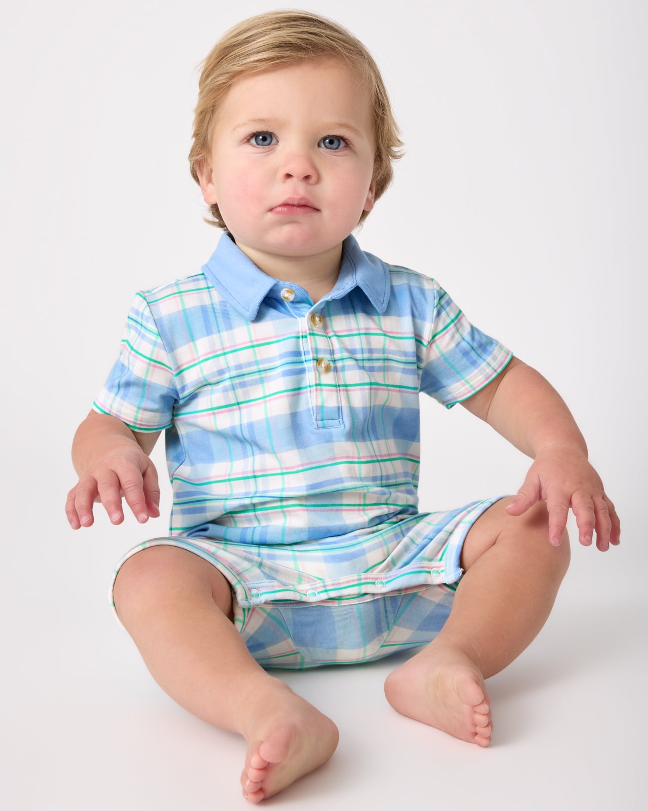 Easter best. The Springtime Plaid Polo Shorty Romper features a classic plaid in soft blue and mint green tones. Made from soft and durable Soluxe® Bamboo. this baby romper has a collared neckline and hidden snaps along the inseam for easy changes. Perfect for sibling matching!